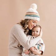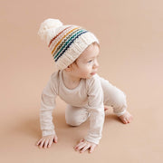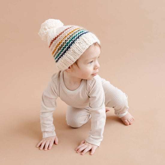 They're like a rainbow, living in color. This adorable hat will have everyone smiling at the whimsical rainbow stripes laid on a charming cream base. Pair it with any Classic Cardigan for a magical moment. Stripes include Cinnamon, Blush, Mustard, Olive, Teal and Navy. No fold-over brim.
